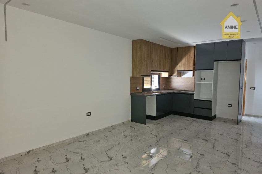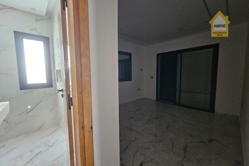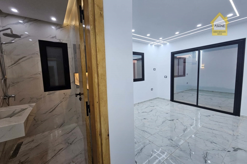 - Construction neuve avec des finitions de qualité (carrelage moderne, faux-plafonds avec spots encastrés, menuiseries noires élégantes).