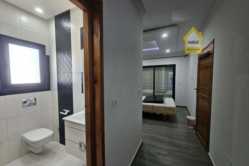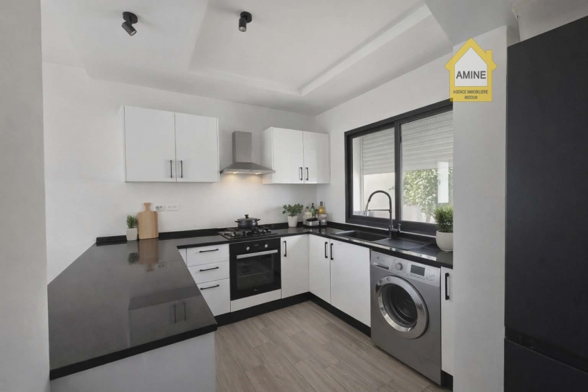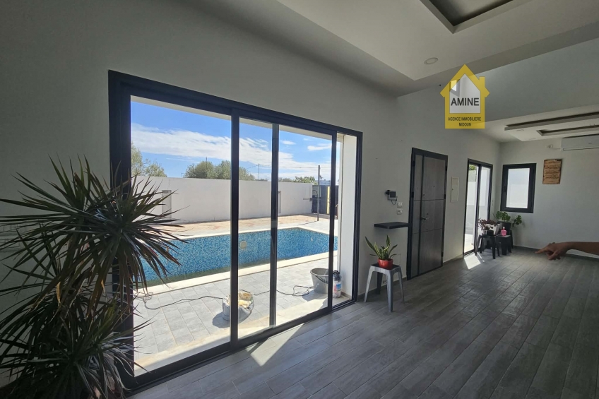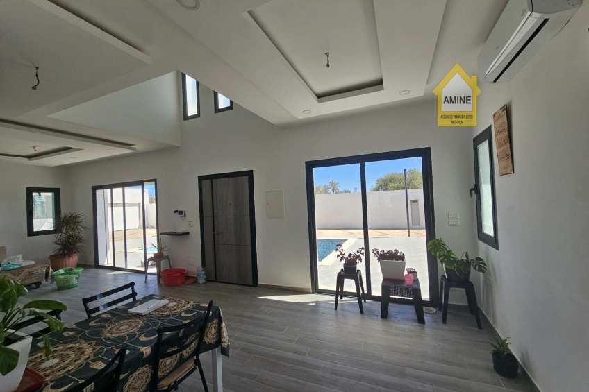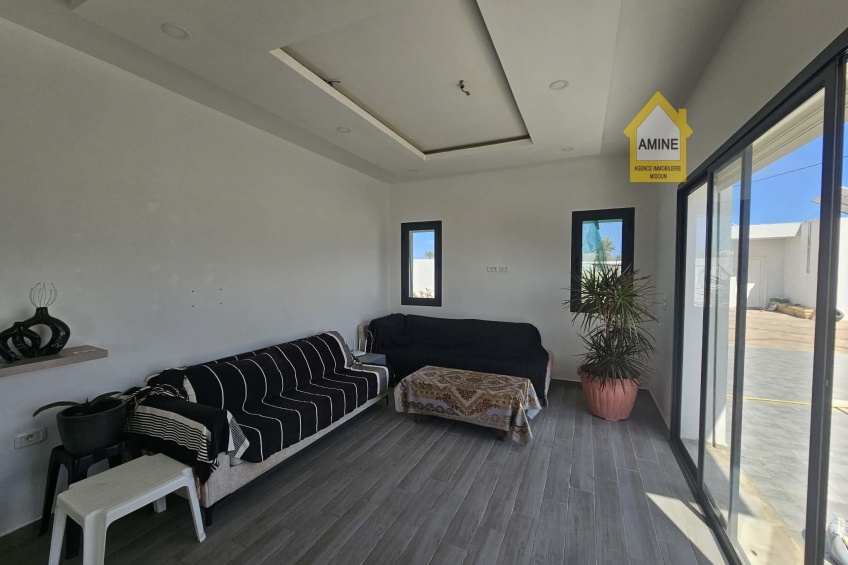 - Découvrez cette magnifique villa moderne entièrement meublée, idéalement située à Midoun, dans un quartier calme et recherché, à seulement 4 km de la plage Seguia et 3 km du centre-ville.