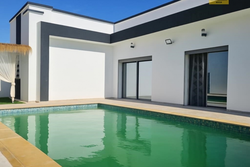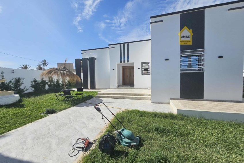 • Découvrez cette superbe villa contemporaine de plain-pied située dans un quartier calme et recherché de Tezdaine – Midoun, à seulement quelques minutes des plus belles plages de Djerba.