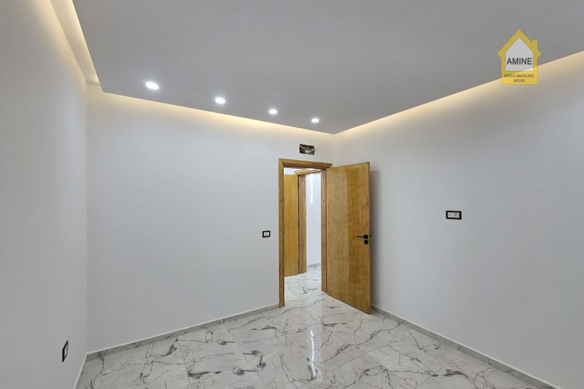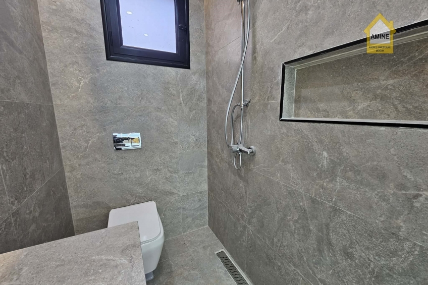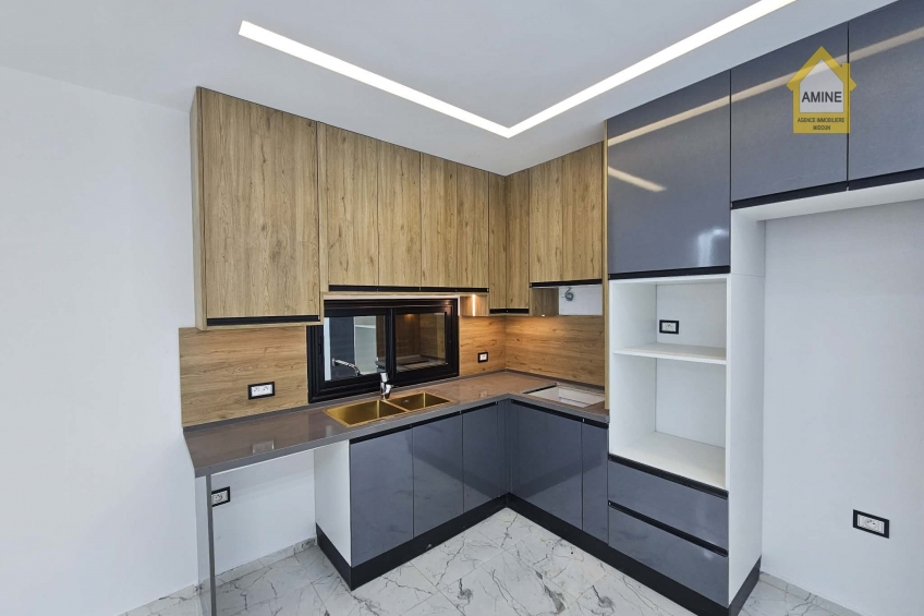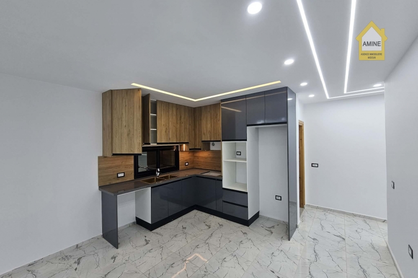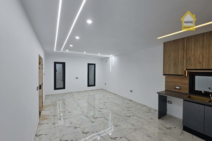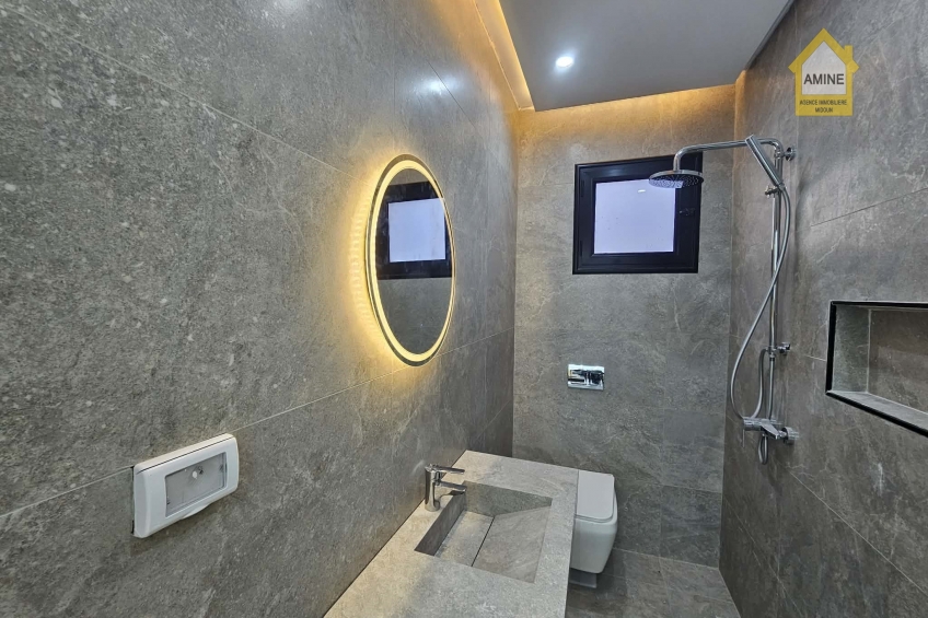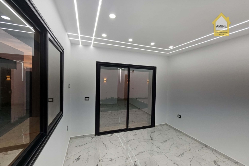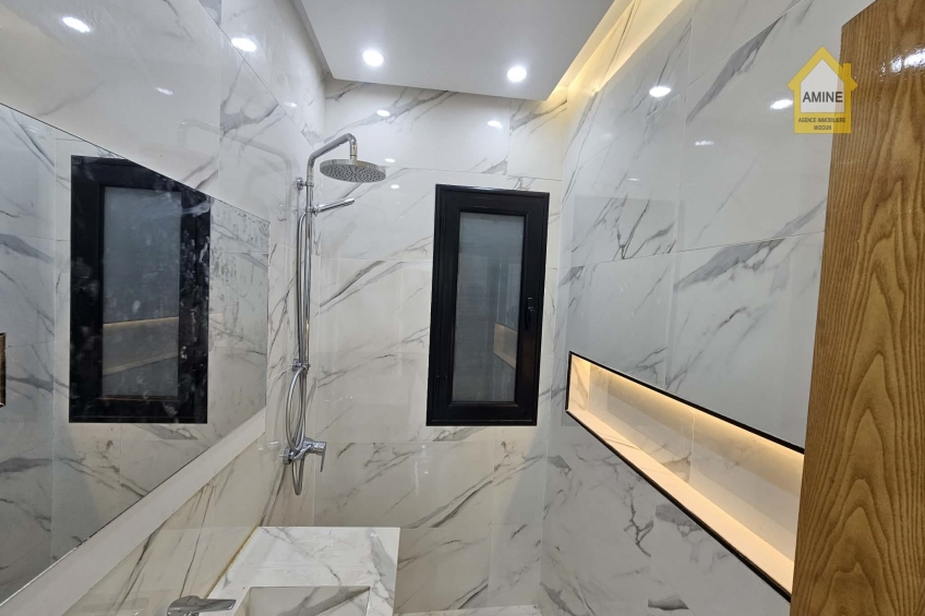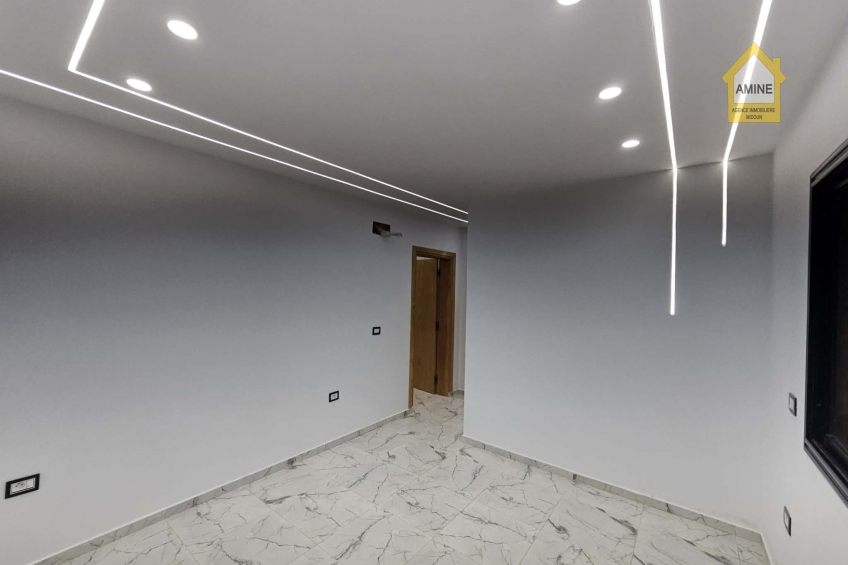- Construction neuve avec des finitions de qualité (carrelage moderne, faux-plafonds avec spots encastrés, menuiseries noires élégantes).