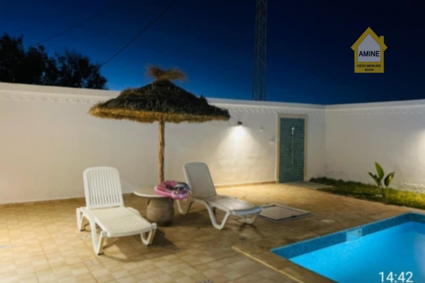 • Située dans un quartier calme et agréable à Midoun, cette belle villa S+4 entièrement meublée offre un cadre de vie idéal, que ce soit pour y vivre ou pour investir.